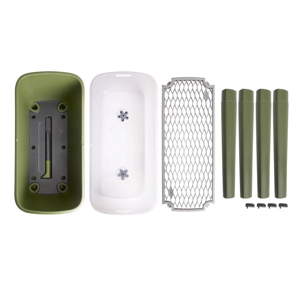 Met de noa kweektafel kweek je eenvoudig je eigen groenten, fruit en kruiden. De kweektafel heeft een geintergreerd watersysteem inclusief een watermeter. Daarnaast komt deze kweektafel ook met een bijpassend kweekhuis en onder de tafel bevindt zich een handige tray. Deze kweektafel is gemaakt van 100% gerecycled plastic, geproduceerd met windenergie en ook nog eens 100% recyclebaar. Daarnaast ook vorstbestendig en verkleurt niet.Alles bij de hand Op ideale werkhoogte kweek je eenvoudig groenten, fruit en kruiden. Of het nu tomatenplanten zijn, sla of basilicum, deze kweektafel op poten is groot genoeg om meerdere planten in te kweken. Onder de tafel, tussen de poten, bevindt zich een handige tray om altijd de juiste kweekaccessoires bij de hand te hebben. Met behulp van de afneembare poten berg je de kweektafel, als het kweekseizoen voorbij is, eenvoudig weer op.Inclusief kweekhuis Het kweekhuis zorgt ervoor dat jouw zaden en plantjes beschermd worden tegen vogels, regen en direct zonlicht. De ventilatie schijfjes creëren een optimaal klimaat en zorgen ervoor dat jouw plantjes onder goede temperatuur en luchttoevoer kunnen groeien. Nooit te natte voetenDe noa kweektafel heeft een eenvoudig watersysteem met een reservoir. De watermeter geeft precies aan wanneer je het water bij moet vullen. Met behulp van de afsluitdop kun je af en toe overmatig water laten weglopen, zodat de wortels van jouw planten gezond blijven. Al deze handige functies komen samen in de mooie en praktische noa kweektafel.
