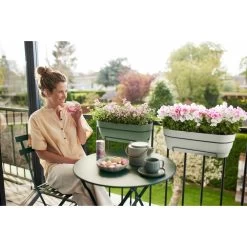 Wil jij meer groen aan je balkonrailing? Dan is de vibia campana balkonbak iets voor jou. Hiermee maak je eenvoudig van een kaal balkon een groene oase. Dankzij de geintegreerde schotel kun je langer genieten van het groen om je heen, omdat overtollig water weg kan en een klein waterreservoir ontstaat voor de drogere dagen. Deze plantenbak is met liefde voor de natuur gemaakt. Gemaakt van 100% gerecycled plastic, geproduceerd met windenergie en ook nog eens 100% recyclebaar.Nooit te natte voetenAlle vibia campana producten hebben een overlooppijpje. Hierdoor kan overtollig water weglopen, waardoor je planten of bloemen nooit te natte voeten hebben. Ideaal voor na een forse regenbui of als je ze zelf net iets te veel water hebt gegeven.Past bij iedere stijlDe vibia campana balkonbak is een mooie aanvulling op jouw balkon of tuin door zijn zachte, ronde vormen en een gave, natuurlijke textuur. Ze zijn beschikbaar in vriendelijke en trendy kleuren, passend bij iedere stijl. Zo kun je rust creëren met bijvoorbeeld antraciet of zijdewit, of meer kleur aanbrengen met bijvoorbeeld honinggeel. Hangt overal op zijn plekDeze vibia campana balkonbak, met geintegreerd metalen rekje van hoge kwaliteit, past op vrijwel ieder balkon. Het past op een railingbreedte tot 6.5cm.