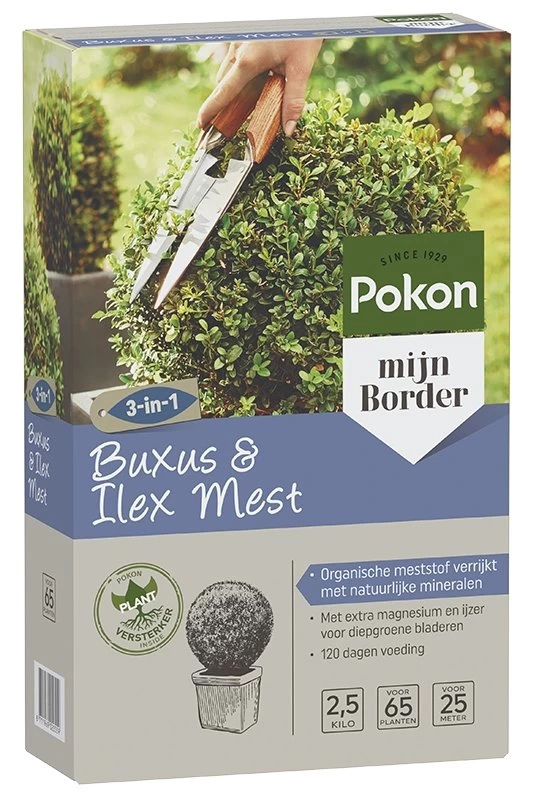 3-in-1 werking: voeding, bodemverbeteraar en plantversterker in 1 korrel. De organische mest van de Pokon Buxus & Ilex Mest, verrijkt met in de natuur voorkomende mineralen zoals zeoliet en algen, voedt de plant en verbetert de grond. Een goed bemeste en gezonde bodem is een belangrijke voorwaarde voor gezonde planten. Door de extra toevoeging van Magnesium (Mg0) en IJzer (Fe) wordt het blad van de buxus en ilex diepgroen van kleur. De voeding en Pokon Plantenversterker zorgen voor sterke planten met een goede weerstand tegen ziektes, plagen en vorst. Pokon Buxus & Ilex Mest geeft tot wel 120 dagen voeding. Pokon Buxus & Ilex Mest kan in de maanden maart t/m augustus gebruikt worden. Voor het beste resultaat voed je je planten 2 keer per jaar, in het vroege voorjaar en in de zomer.