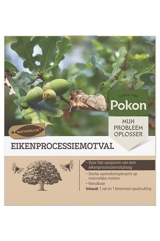 Pokon Eikenprocessiemotval is een detectieval enkel voor monitorings-doeleinde: de aantastingsgraad kan gedurende het hele seizoen gevolgd worden. De val heeft geen invloed op andere, nuttige insecten. Plaats de Pokon Eikenprocessiemotval eind mei/begin juni zo hoog mogelijk in de boom (bij voorkeur > 5 meter) aan een dicht-bebladerde tak. De mannelijke motten worden aangetrokken door het feromoon (de vloeistof uit de spuitvulling), dringen de val binnen en worden gevangen genomen. Het doorzichtige reservoir laat eenvoudig de aanwezigheid van motten zien. Raak het feromoon zo min mogelijk aan om maximale aantrekking te garanderen. De werkingsafstand van het feromoon is gelimiteerd tot 50-100 meter. Voor het beste resultaat plaats 1 val per eikenboom en maximaal 5 vallen per hectare. Inhoud: 1 val en 1 feromoon spuitvulling.