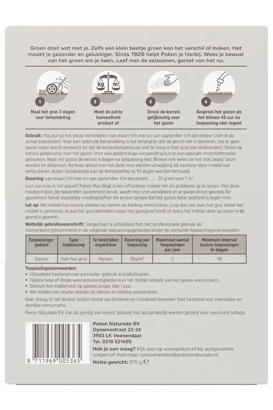 Last van mos in het gazon? Pokon Mos Weg! is een effectieve manier om dit probleem op te lossen. Met deze mosbestrijder, die bovendien gazonmest bevat, wordt mos snel verwijderd en je gazon direct gevoed. De gazonmest bevat essentiële voedingsstoffen die ervoor zorgen dat het gazon beter bestand is tegen mos. Mos kun je het beste behandelen van maart t/m mei en van september t/m december (niet in de zomer toepassen). Voor een optimale behandeling is het belangrijk dat de grond niet bevroren is, dat er geen zware regen wordt verwacht en dat de buitentemperatuur niet te hoog is (het gras kan verbranden). Maai het gazon de eerste 4 dagen na toepassing niet. Binnen een week zal het mos zwart/bruin worden en afsterven. Na twee weken kan het dode mos worden verwijderd, bij voorkeur door middel van verticuteren. Indien noodzakelijk kan de behandeling na 90 dagen worden herhaald.