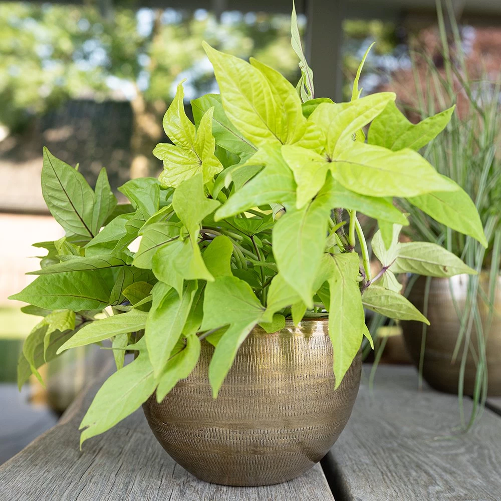 Grote bloempotten van aluminium speciaal voor luxe outdoor ruimtes. Maak de veranda en serre helemaal af met deze handgemaakte eyecatchers. Pot Rowen heeft een sierlijke gedetailleerde structuur, die met de hand wordt aangebracht. Authentiek en artistiek is deze opvallende verschijning voor alle soorten buitenruimtes. Werkelijk een juweel voor uw buitenruimte. De serie Rowen is verkrijgbaar in potten tot 62cm hoog en vazen tot 90cm hoog. Er is keuze uit verschillende metaaltinten. Aluminium potten zijn zeer licht van gewicht, nog lichter dan andere metalen. Daarnaast heeft aluminium een roestvrije toplaag. Maar let op, aluminium is onderhevig aan bepaalde weersomstandigheden. Laat u goed informeren over de locatie voor deze bijzondere pot.